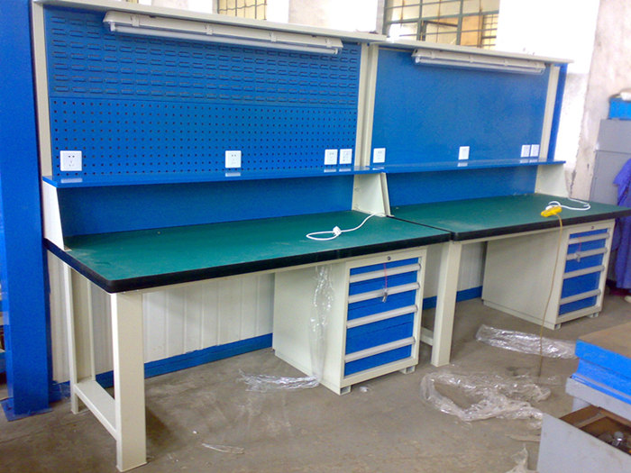 工作臺適合于模具、鉗工、檢測、維修、組裝等各種不同應用場合,具有良好的耐腐蝕性,耐臟性,抗沖擊性和承重能力強。桌面經特殊處理,具有防腐、抗沖擊力強等特點,多種桌面的選擇,可配合不同的使用要求;所配置的抽屜、柜門方便使用者存儲工具;桌角上預留電源孔,方便安裝電源插座。